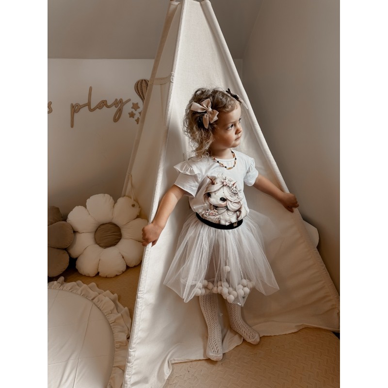 Bawełniana koszulka na krótki rękaw wykończony na surowo z pięknym nadrukiem, który zachwyci każdą dziewczynkę. To idealne połączenie wygody i elegancji na każdą okazję – Twoja mała modnisia będzie zachwycona!