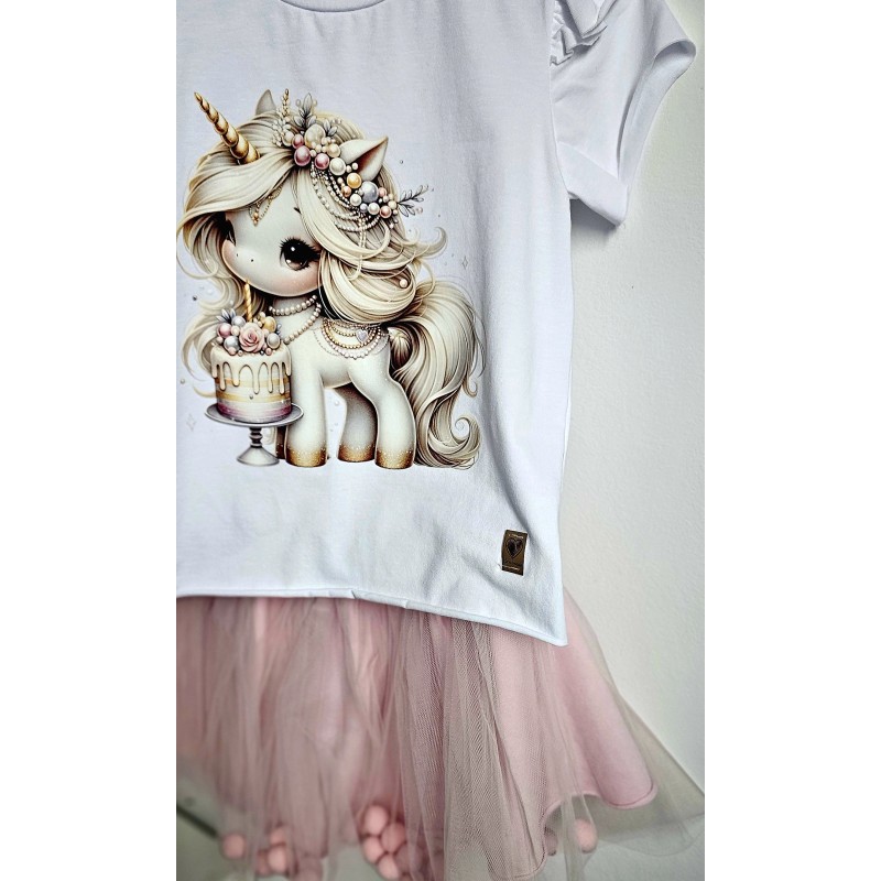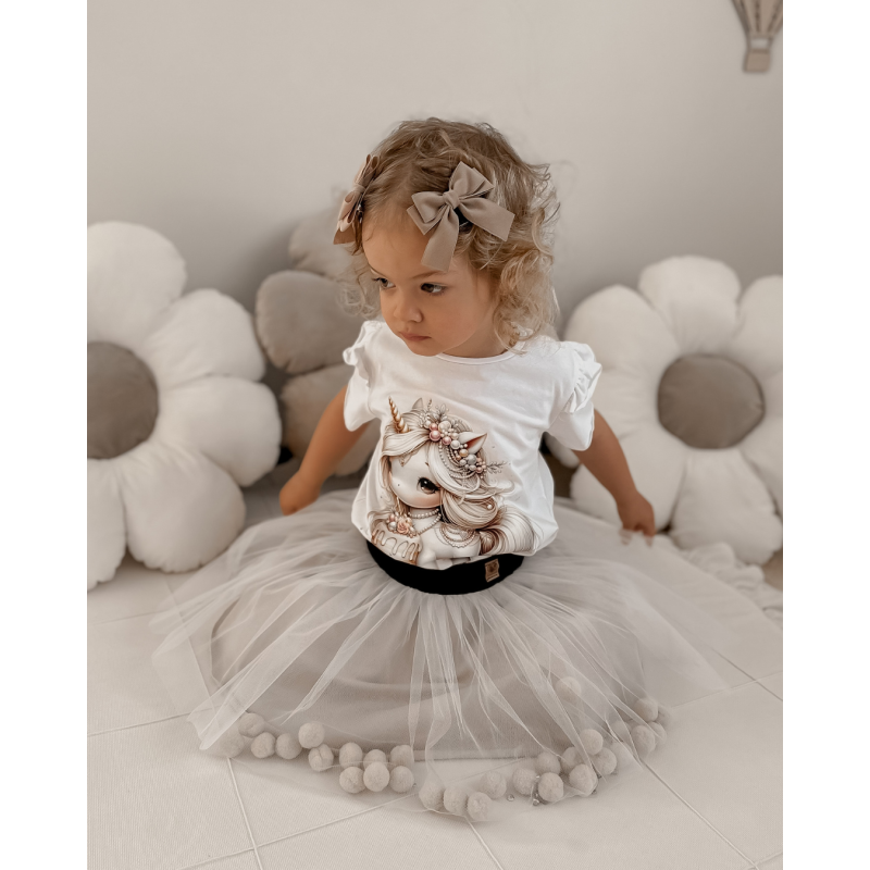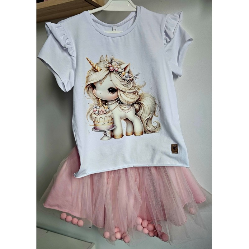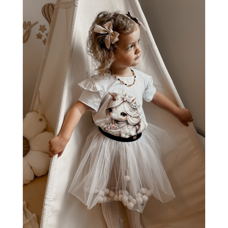 Nasza bluzka i spódniczka to wymarzony komplet dla każdej dziewczynki, która chce błyszczeć. Dzięki starannemu wykonaniu i unikatowym detalom, takim jak motylki na rękawach oraz przepięknym nadrukiem bluzka jest pełna uroku i wdzięku. Spódniczka, z dodatkową warstwą tiulu, jest efektowna, puszysta i dodaje stylizacji magicznego wyrazu, idealna na uroczystości i na co dzień